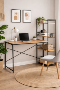 Duży blat roboczy zapewnia wygodne miejsce na laptop, monitor, dokumenty i niezbędne akcesoria, a wbudowany boczny regał pomaga utrzymać porządek i mieć wszystko pod ręką. To idealne rozwiązanie dla osób, które cenią funkcjonalność i estetykę w jednym.
