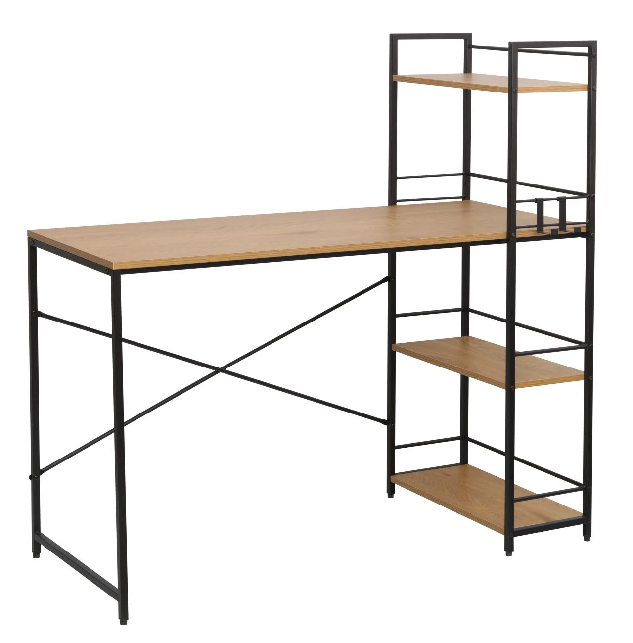 Praktyczne, nowoczesne i stylowe — to biurko komputerowe z bocznym regałem świetnie sprawdzi się w domowym biurze, pokoju młodzieżowym lub kąciku do nauki. Połączenie dekoru dębu naturalnego z czarnym, metalowym stelażem nadaje mu modny industrialny charakter, który pasuje zarówno do loftowych, jak i nowoczesnych wnętrz.