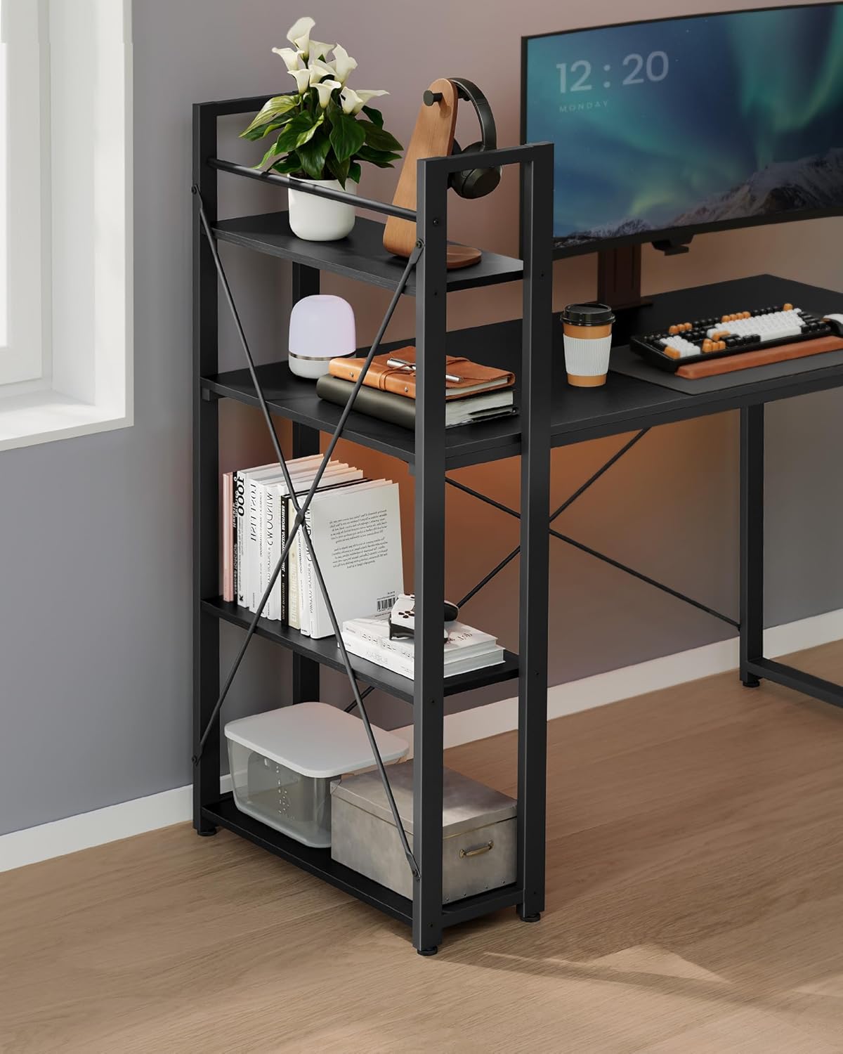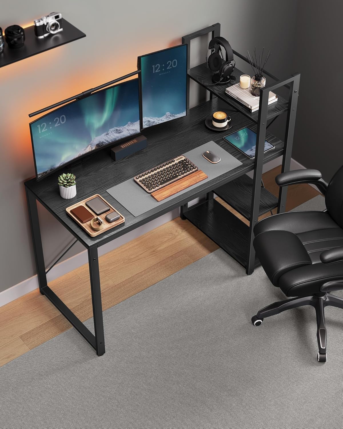 - Przestronność: Duży blat biurka i dodatkowe półki zapewniają dużo miejsca do przechowywania.