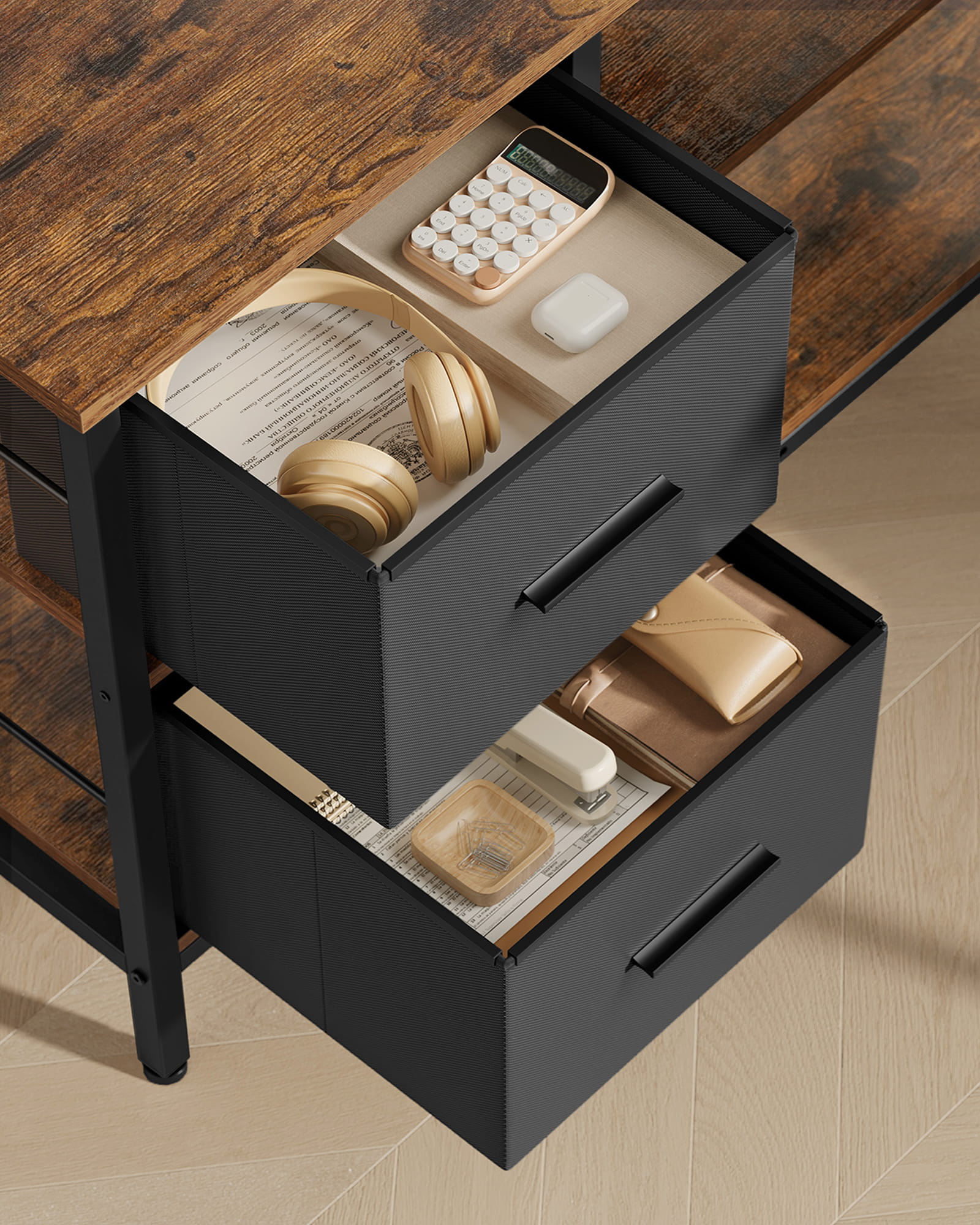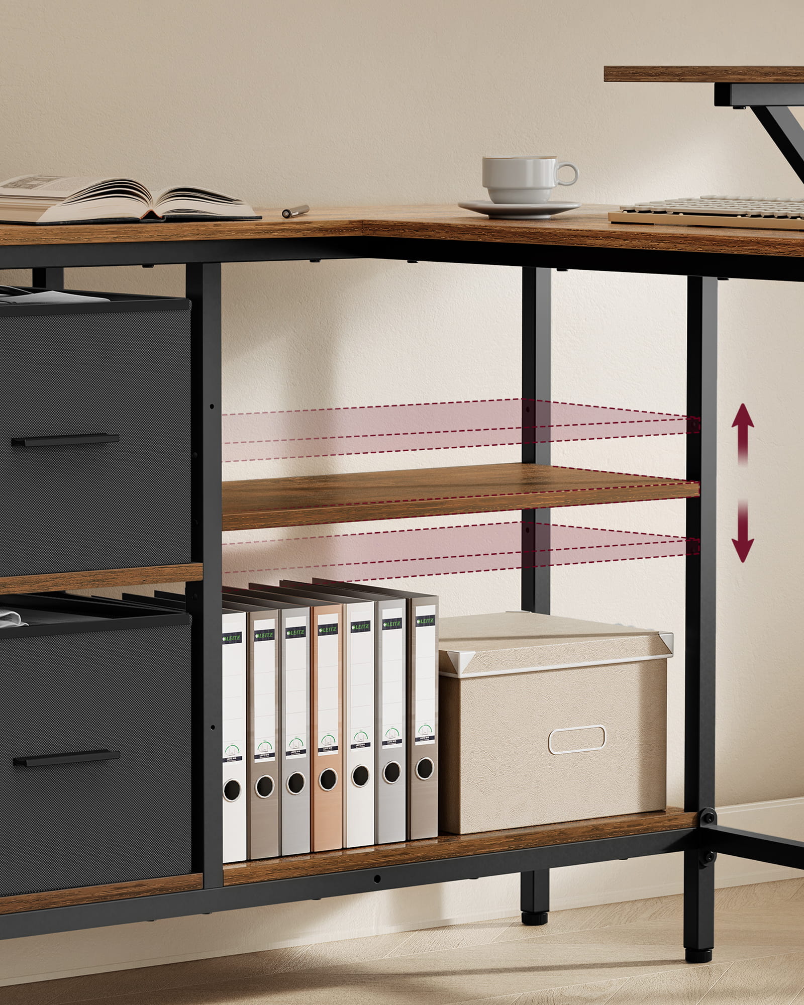 Nasze biurko oferuje aż dwie pojemne szuflady, które pomieszczą wszystkie niezbędne dokumenty i akcesoria biurowe. Dodatkowo, regulowana na trzech poziomach półka pozwala na dostosowanie przestrzeni do Twoich potrzeb, zapewniając wygodny dostęp do najczęściej używanych przedmiotów.
