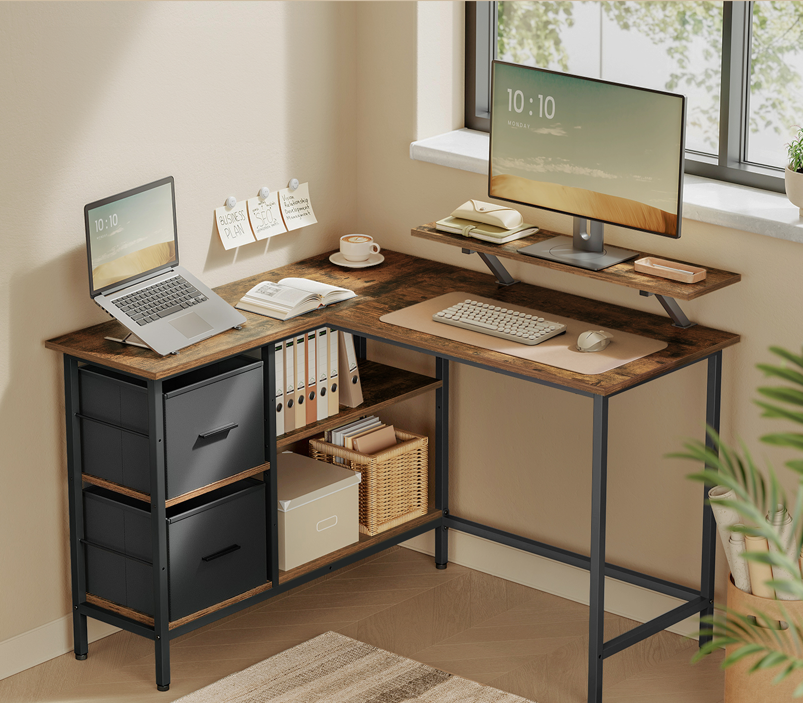 Szukasz idealnego rozwiązania do domowego biura, sypialni lub salonu? Nasze biurko narożne w kształcie litery L o wymiarach 105 x 115 x 89,5 cm to doskonały wybór dla osób ceniących funkcjonalność i nowoczesny design. Dzięki odwracalnej konstrukcji możesz samodzielnie zdecydować, po której stronie zamontujesz szuflady – lewą czy prawą, idealnie dopasowując biurko do każdego kąta w Twoim wnętrzu.