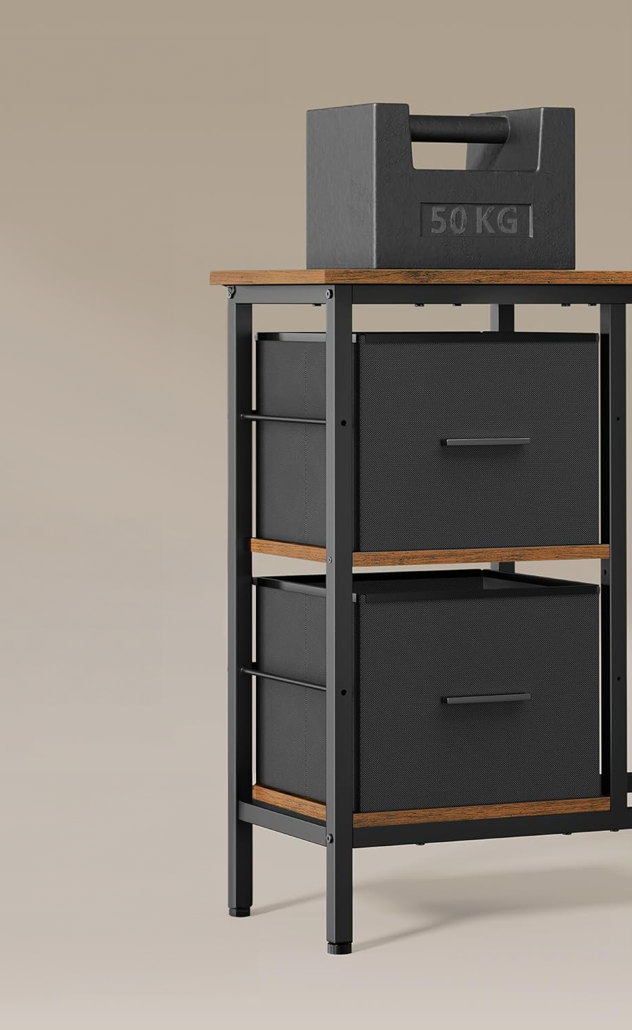 Nie musisz martwić się o stabilność – biurko wykonane jest z wytrzymałej stalowej ramy i wzmocnionych poprzeczek, co zapewnia udźwig do 50 kg na blacie oraz 20 kg na stojaku pod monitor.