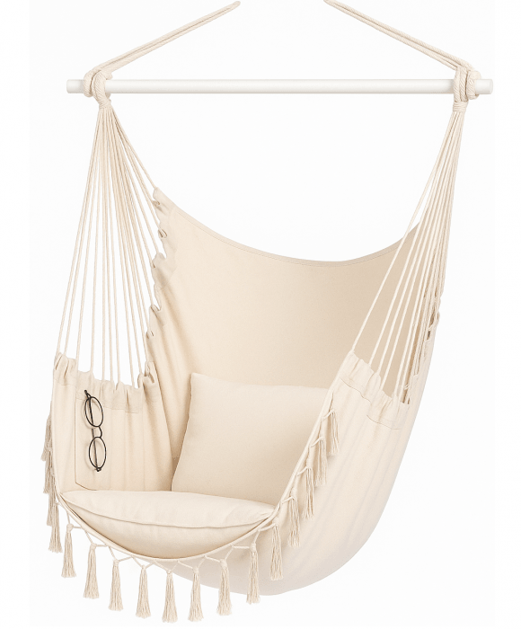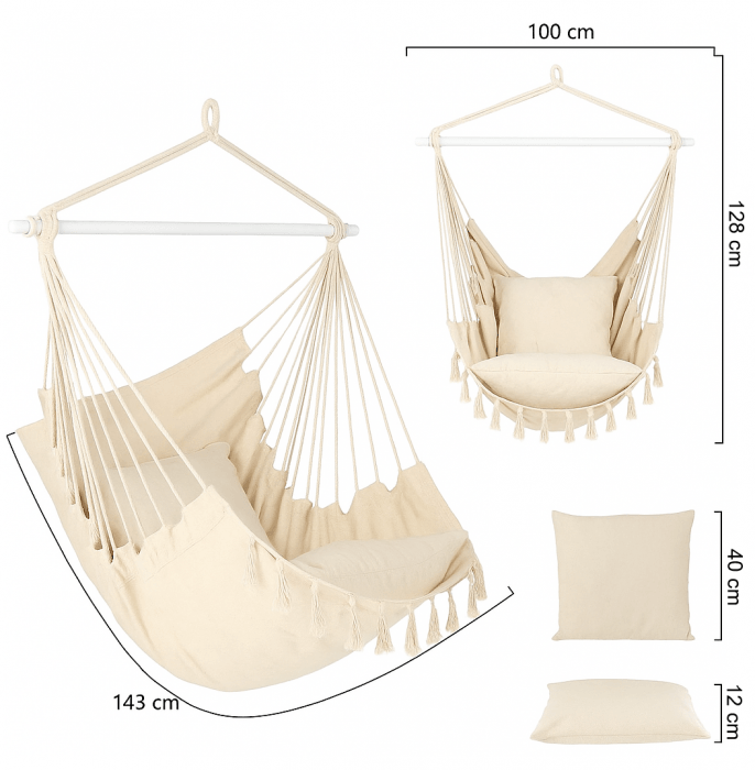 Hamak fotel wiszący ogrodowy brazylijski 100 cm Beżowy + 2 poduszki (1)