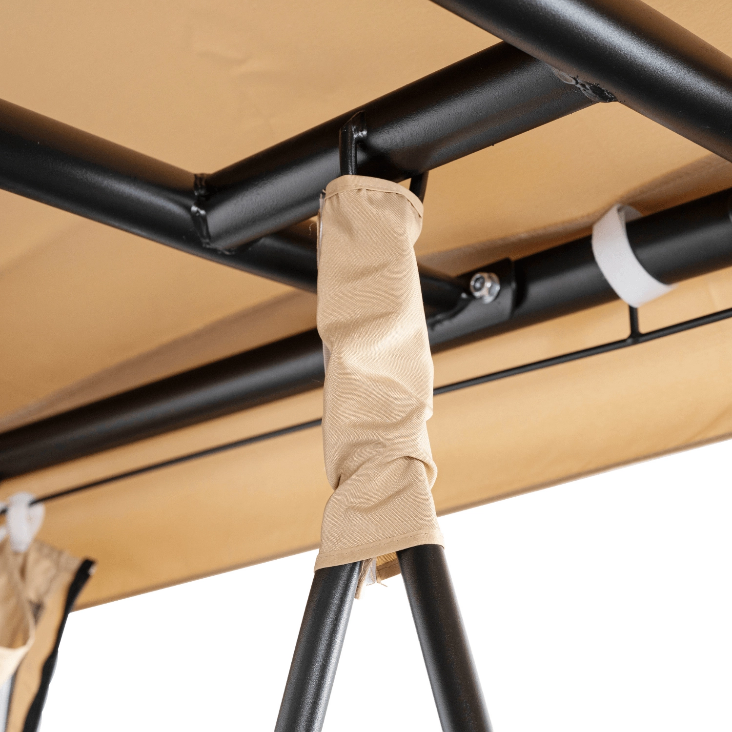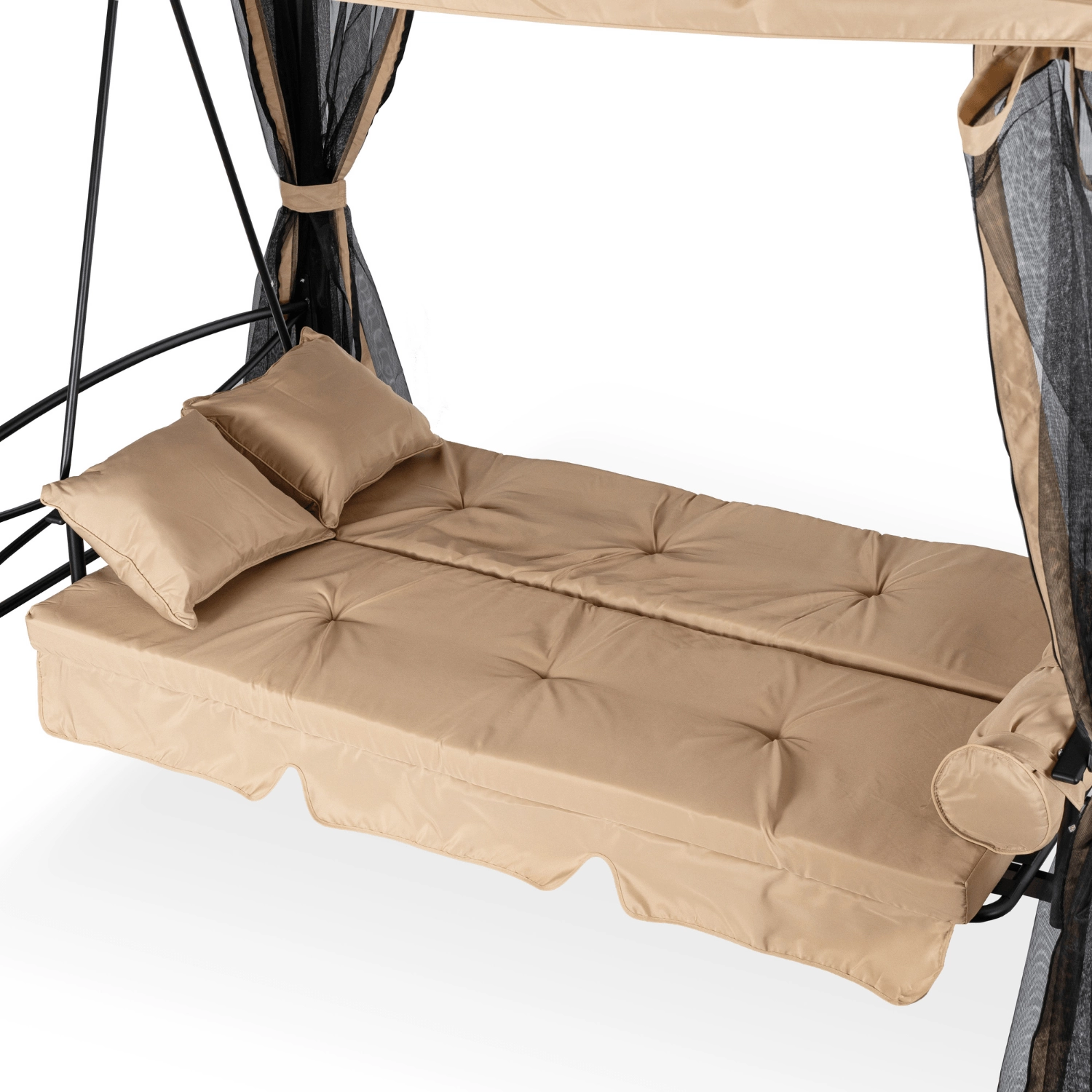 Huśtawka została wyposażona w rozsuwaną moskitierę, która skutecznie chroni przed owadami, jednocześnie nie ograniczając przewiewu. Hydrofobowy daszek zabezpiecza przed słońcem i lekkim deszczem, dzięki czemu możesz korzystać z niej w różnych warunkach.