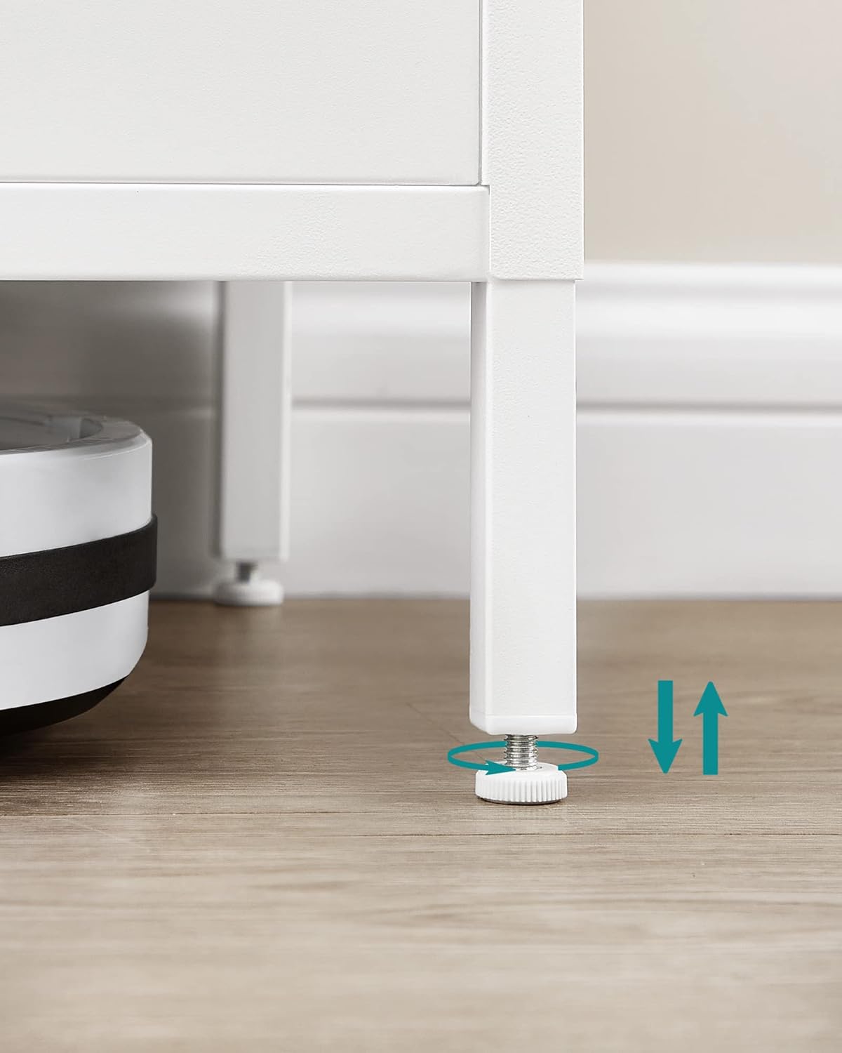 Szafka oferuje elastyczną przestrzeń – regulowana półka umożliwia przechowywanie przedmiotów o różnych gabarytach, od akcesoriów kuchennych i naczyń po pudełka, tekstylia czy sprzęt domowy. Metalowa konstrukcja jest odporna na wilgoć i bardzo łatwa w czyszczeniu, co świetnie sprawdza się w codziennym użytkowaniu.