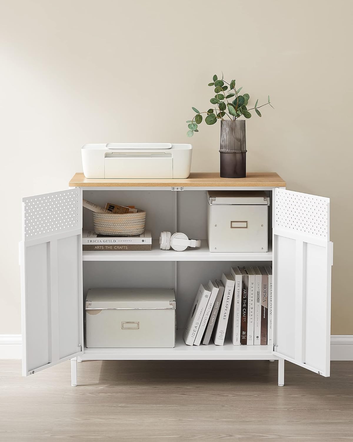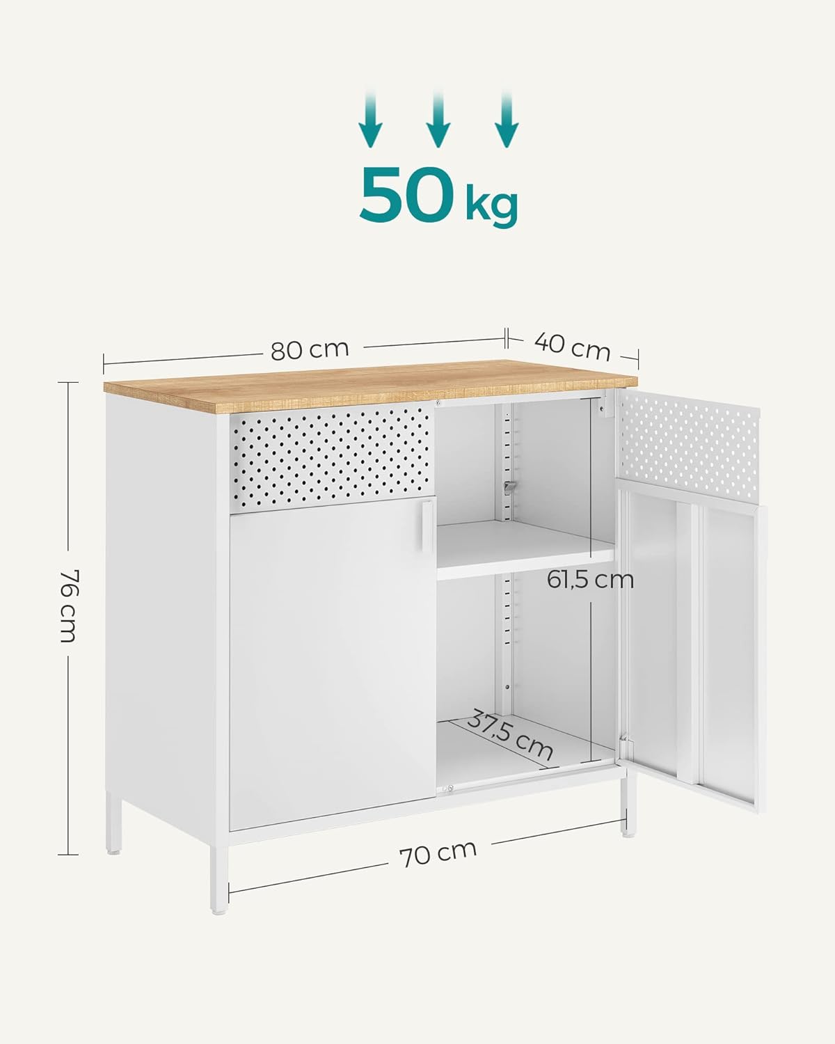 Uniwersalna szafka metalowa z blatem w dekorze drewna – idealna jako kredens do kuchni i jadalni, szafka RTV do salonu lub organizer do biura. Regulowana półka, perforowany panel zapewniający wentylację i łatwy montaż.