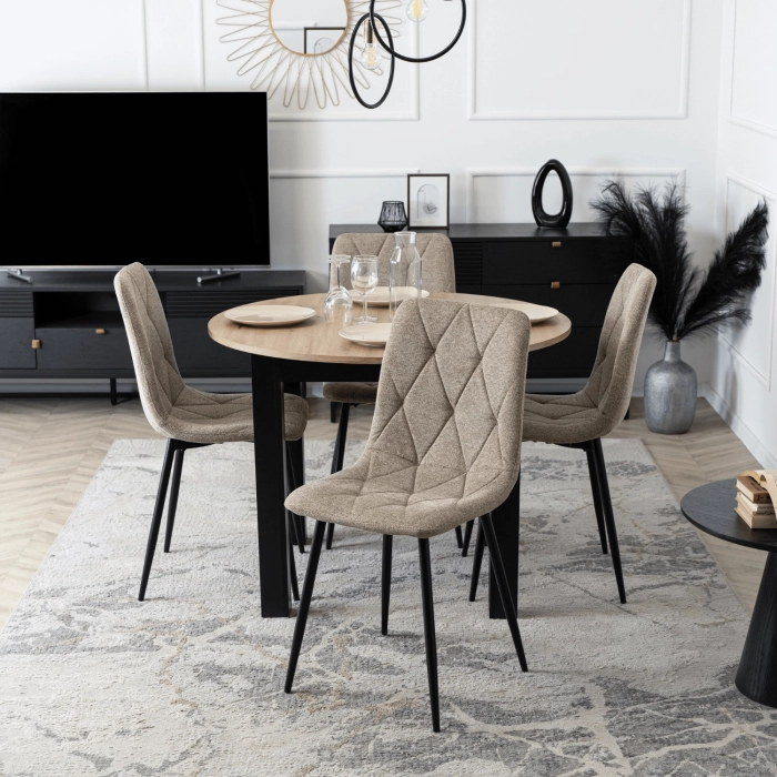 Krzesło Diamo to połączenie eleganckiej tkaniny z efektownym pikowaniem i smukłymi metalowymi nogami. Dzięki uniwersalnemu kolorowi i nowoczesnej formie doskonale sprawdzi się w jadalni, salonie czy biurze, nadając wnętrzu lekkości i stylu.