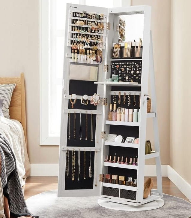 Lustro stojące na biżuterię i organizer do makijażu jest zarówno wyjątkowy jak i praktyczne, stanowi idealny mebel dla kobiet doceniających elegancję i organizację.