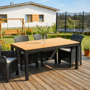 Stół ogrodowy ARGOS to połączenie nowoczesnego wyglądu, wygody użytkowania i praktycznych rozwiązań, które świetnie sprawdzą się w codziennym korzystaniu z tarasu, ogrodu. Elegancki blat w kolorze dębu pięknie komponuje się z czarną, metalową konstrukcją, tworząc stylowy mebel do nowoczesnych przestrzeni zewnętrznych.
