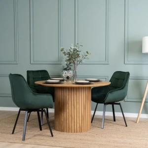 Stół do jadalni Carlo w kolorze dębu złotego to designerski i nowoczesny element wyposażenia Twojej jadalni. Jego okrągły kształt o średnicy 120 cm nadaje się doskonale do spotkań rodzinnych oraz przyjęć ze znajomymi, zachęcając do swobodnej rozmowy i wspólnego dzielenia się posiłkami.