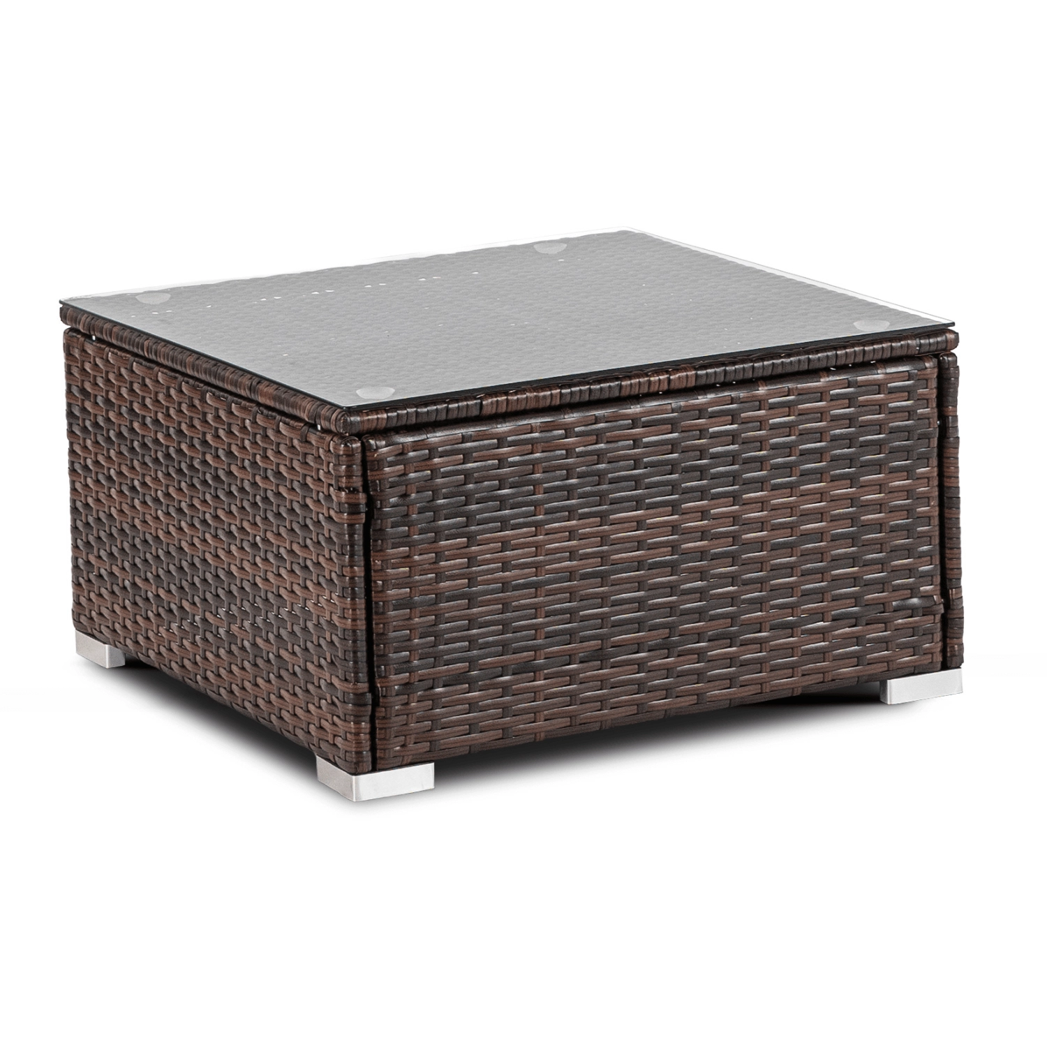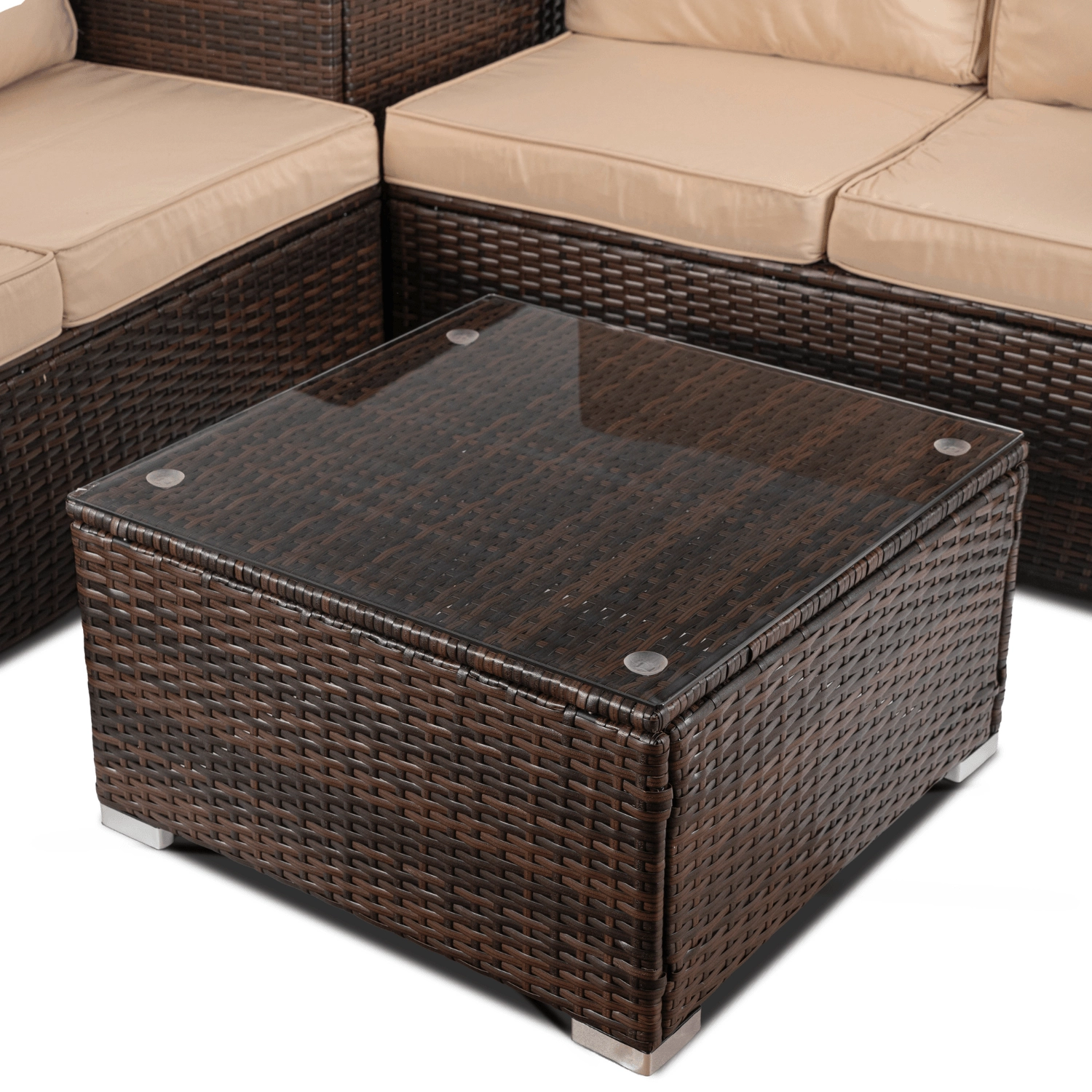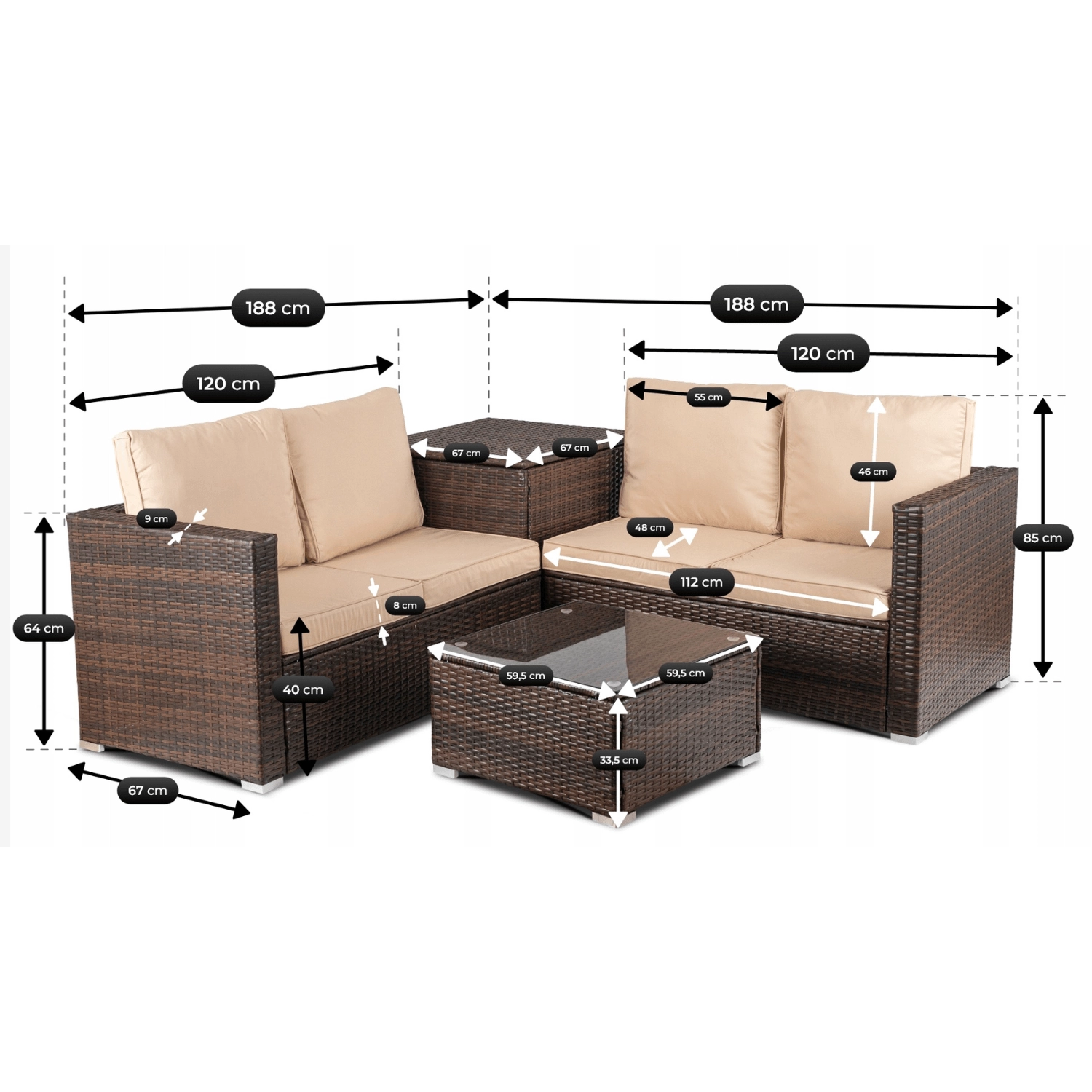 Zestaw mebli ogrodowych MALIBU Brązowy/Beżowy to nowoczesny komplet narożny z praktycznym schowkiem i stolikiem ze szklanym blatem. Trwały technorattan, wygodne poduszki i ciepła kolorystyka sprawiają, że idealnie sprawdzi się w ogrodzie, na tarasie lub patio.