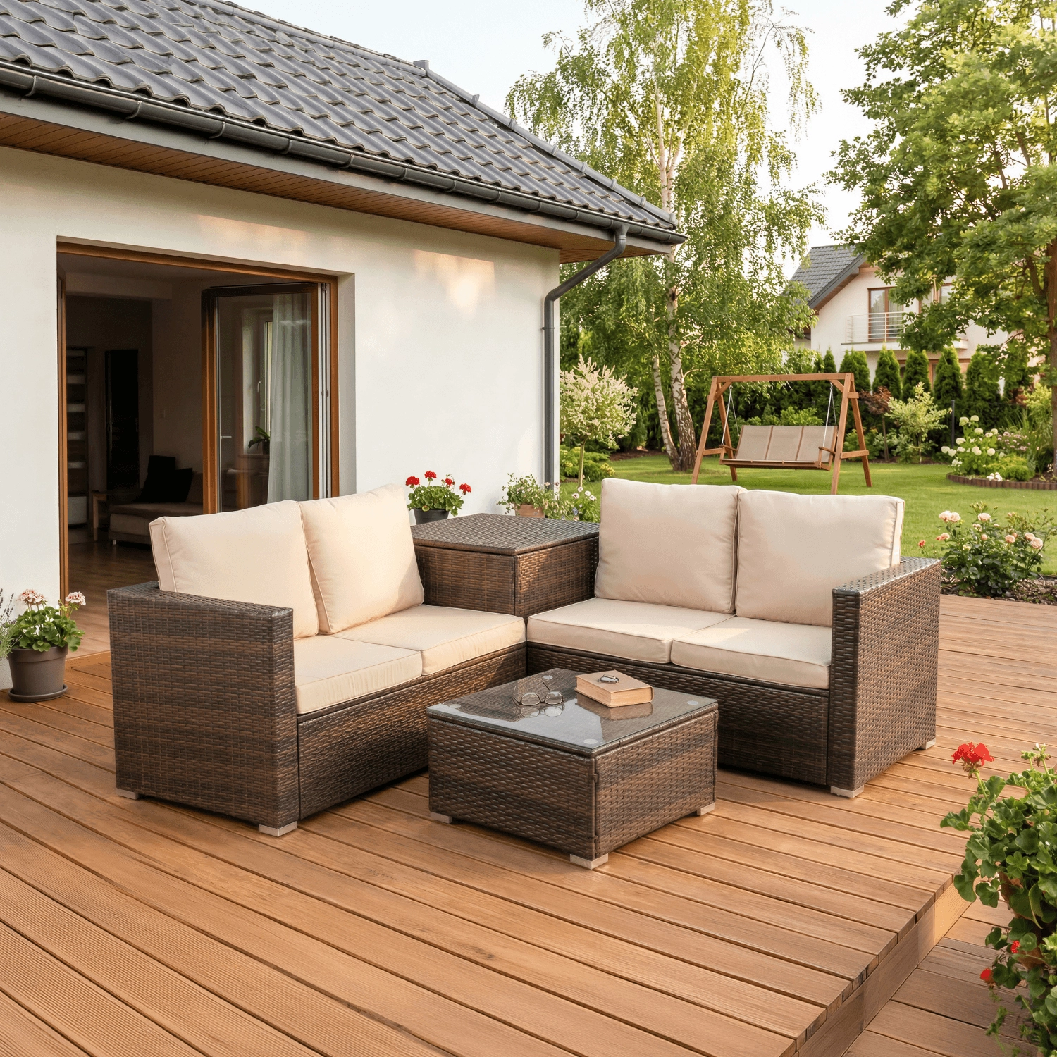 Wbudowany pojemnik pozwala przechowywać poduszki, koce i akcesoria ogrodowe, pomagając utrzymać porządek.