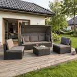 To rozwiązanie, które wyróżnia ten zestaw i podnosi komfort wypoczynku w słoneczne dni. Daszek daje przyjemny cień i pozwala stworzyć bardziej prywatną, przytulną strefę relaksu.