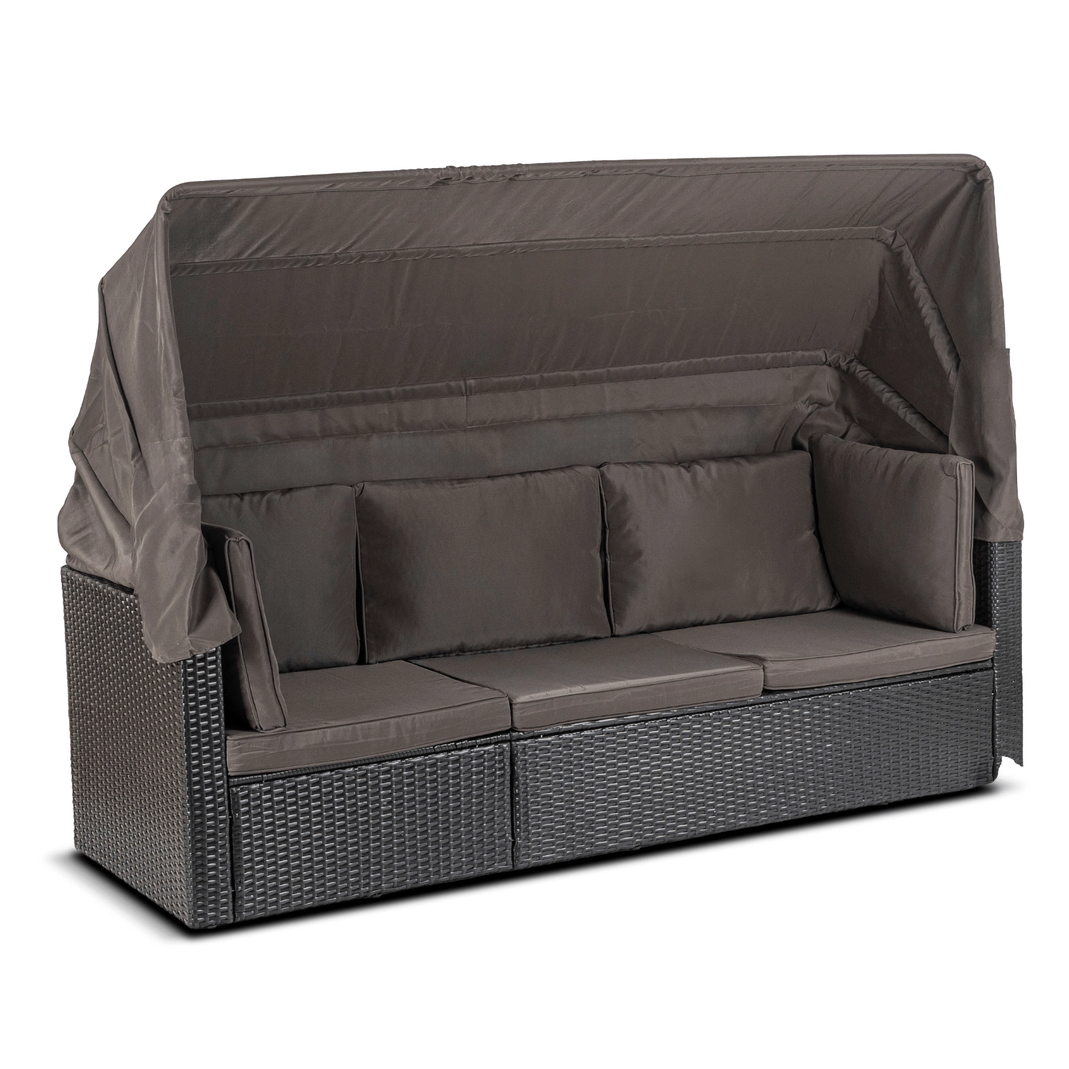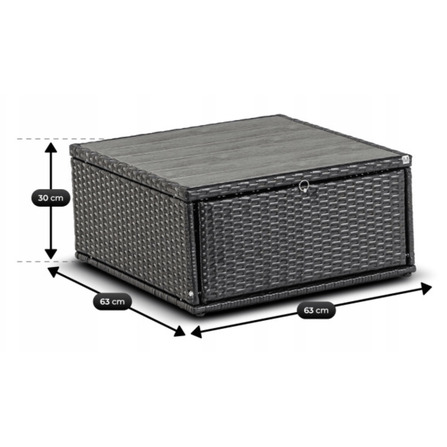 Zestaw mebli ogrodowych PORTOFINO Czarny to elegancki komplet z sofą z rozkładanym daszkiem, dwoma fotelami i praktycznym stolikiem. Trwały technorattan, wygodne poduszki i nowoczesny design sprawiają, że idealnie nadaje się do ogrodu, na taras lub patio.
