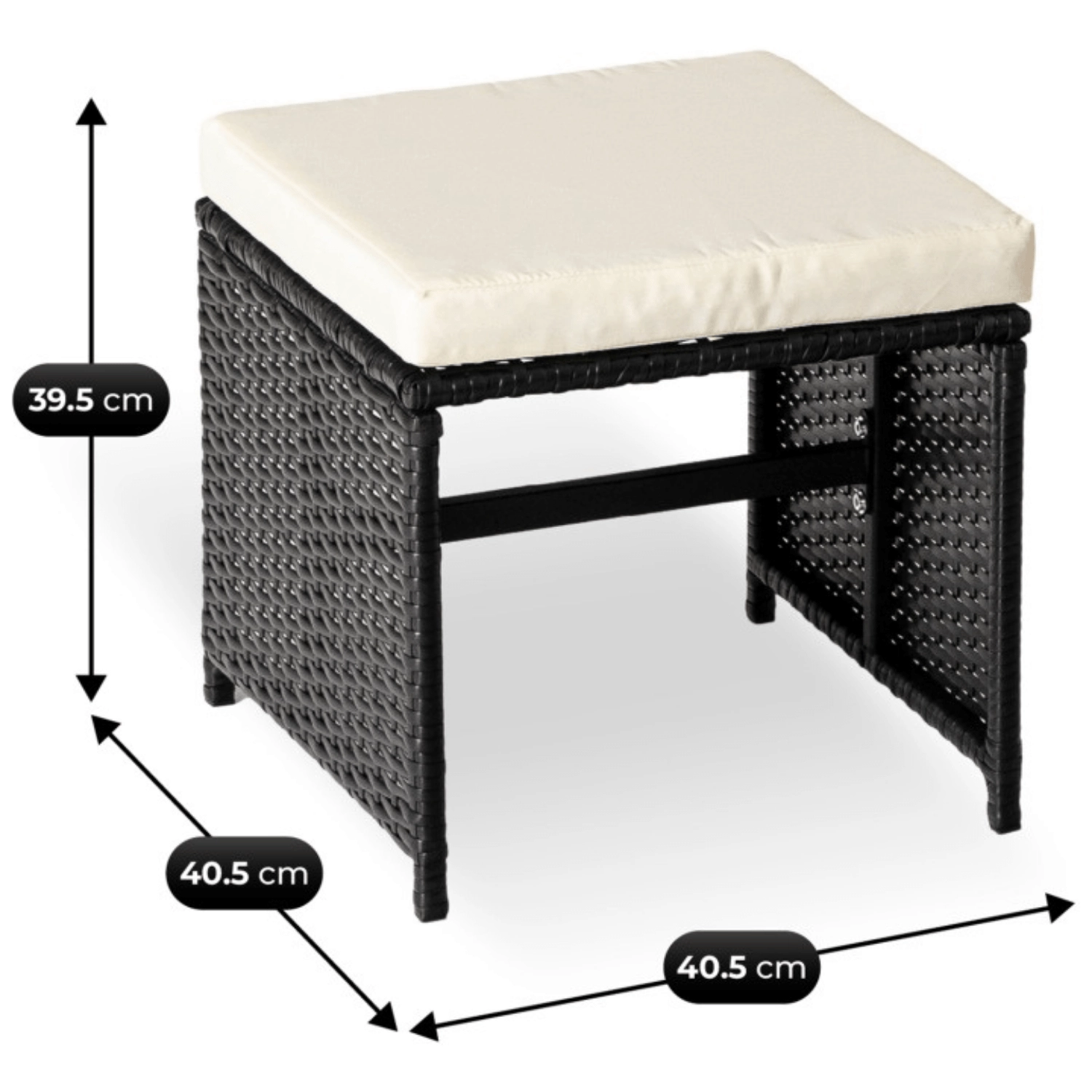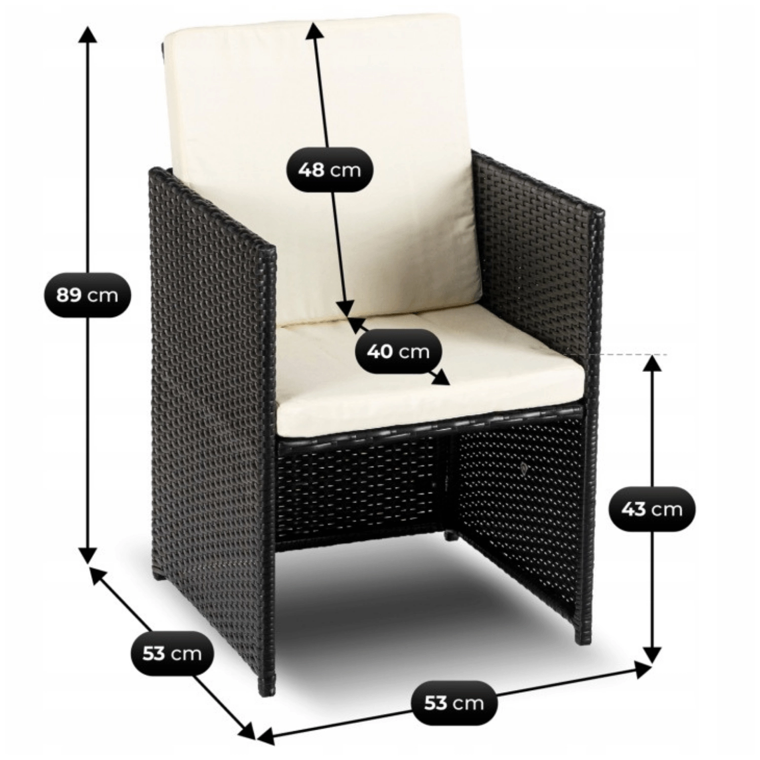 Cztery wygodne fotele z wysokim oparciem i podłokietnikami zapewniają stabilne, komfortowe podparcie – idealne na długie rozmowy i spokojne popołudnia. Do tego dwie praktyczne pufy, które możesz wykorzystać jako dodatkowe siedziska lub podnóżki.