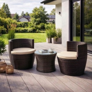 Dużym atutem zestawu Petra jest jego kompaktowa forma przechowywania. Elementy można złożyć w jedną zwartą całość – fotele wsunąć jeden w drugi, a stolik ułożyć na górze. To praktyczne rozwiązanie, które pomaga zaoszczędzić miejsce poza sezonem.