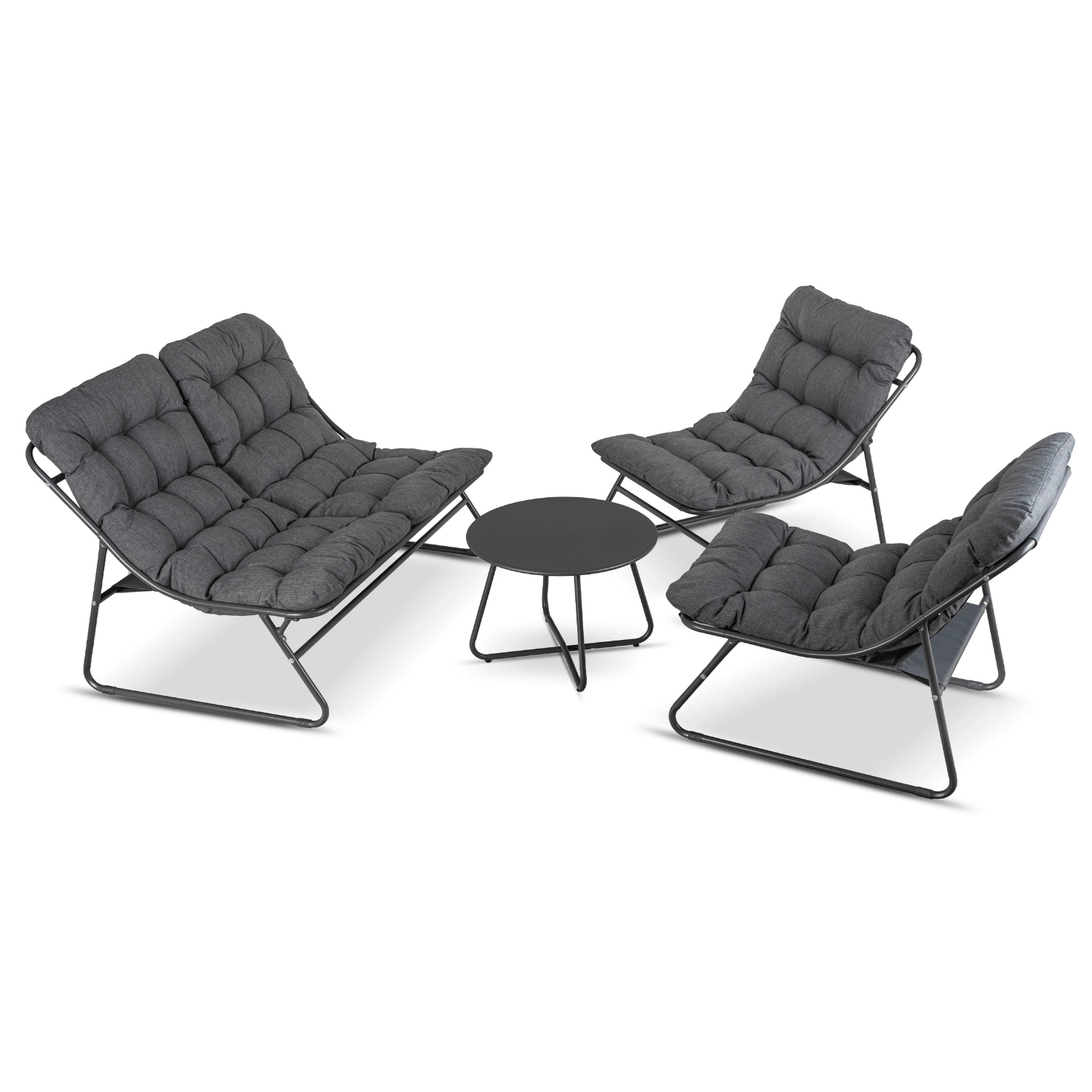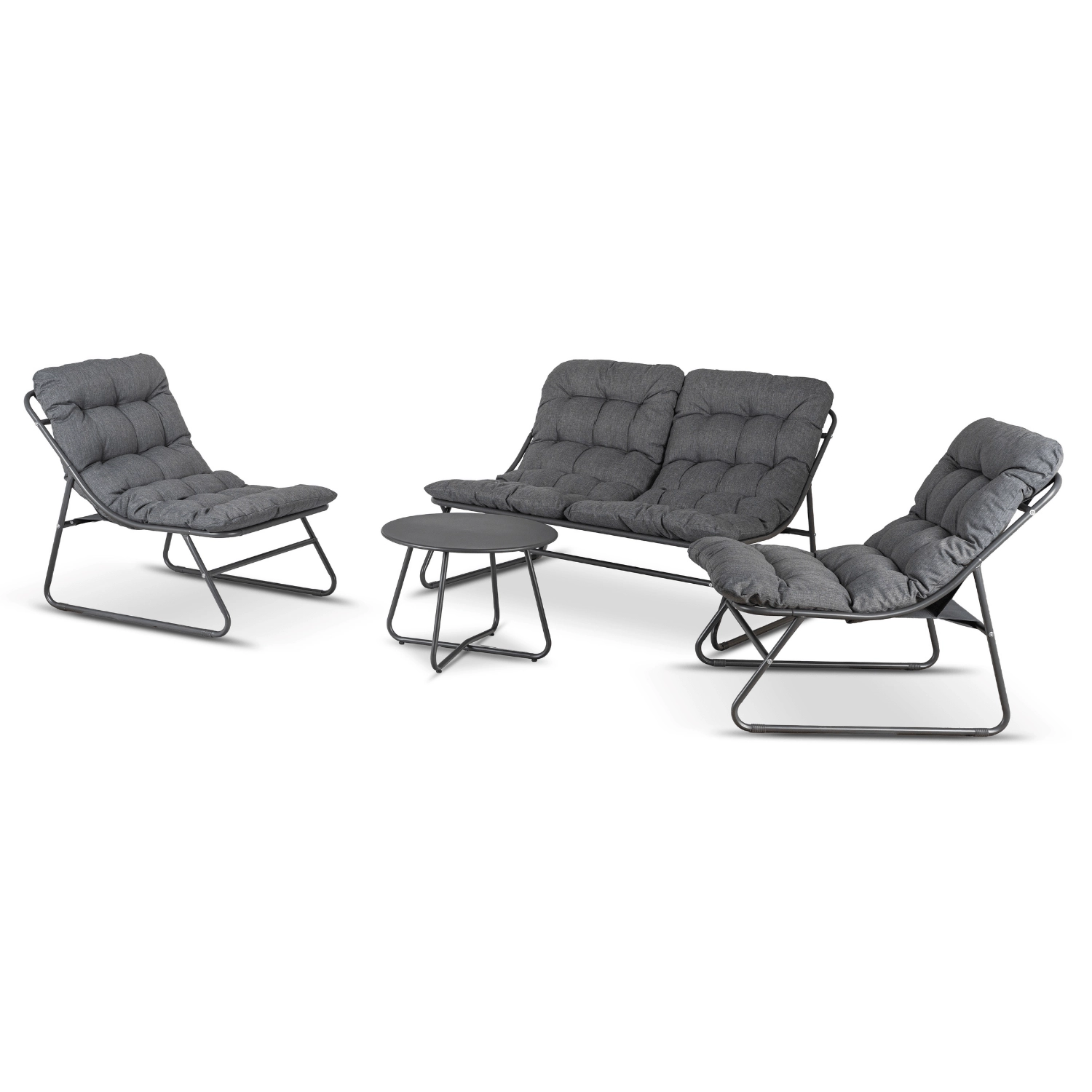 Zestaw mebli ogrodowych ZELIE to elegancki komplet wypoczynkowy z sofą dwuosobową, dwoma fotelami i stolikiem w modnym szarym kolorze. Idealny do ogrodu, na taras lub patio – zapewnia wygodę, styl i komfortowy relaks każdego dnia.